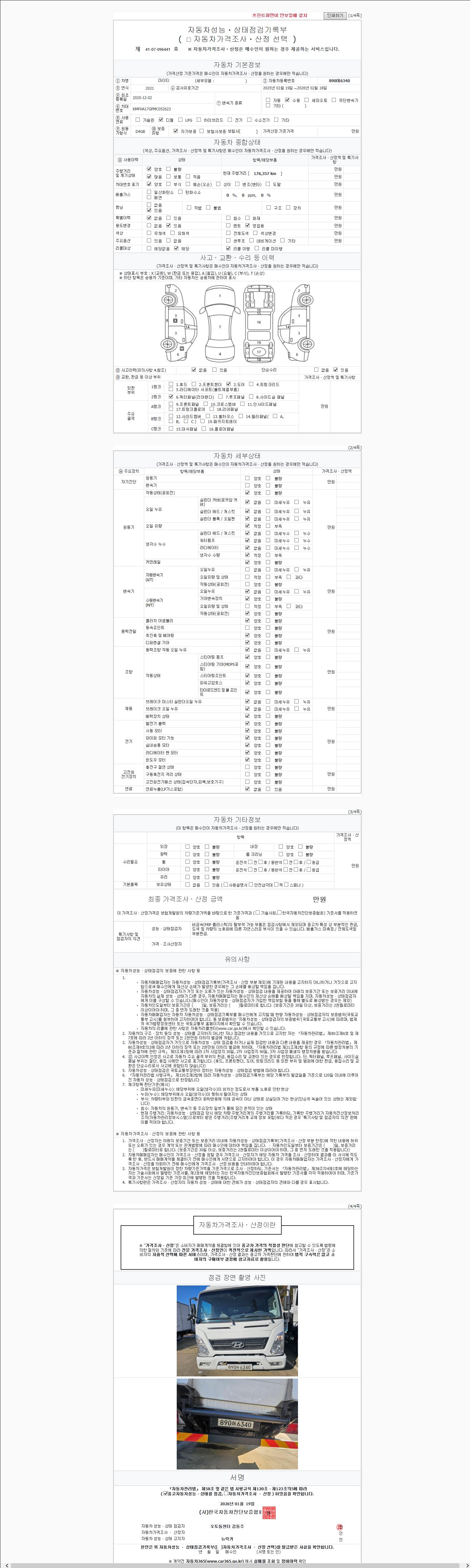 | 주행거리 | 176,312 km | 차량번호 | 890어6340 | 사고유무 | 성능기록부 참조 | 제시번호 | 제 2147483647 호 |