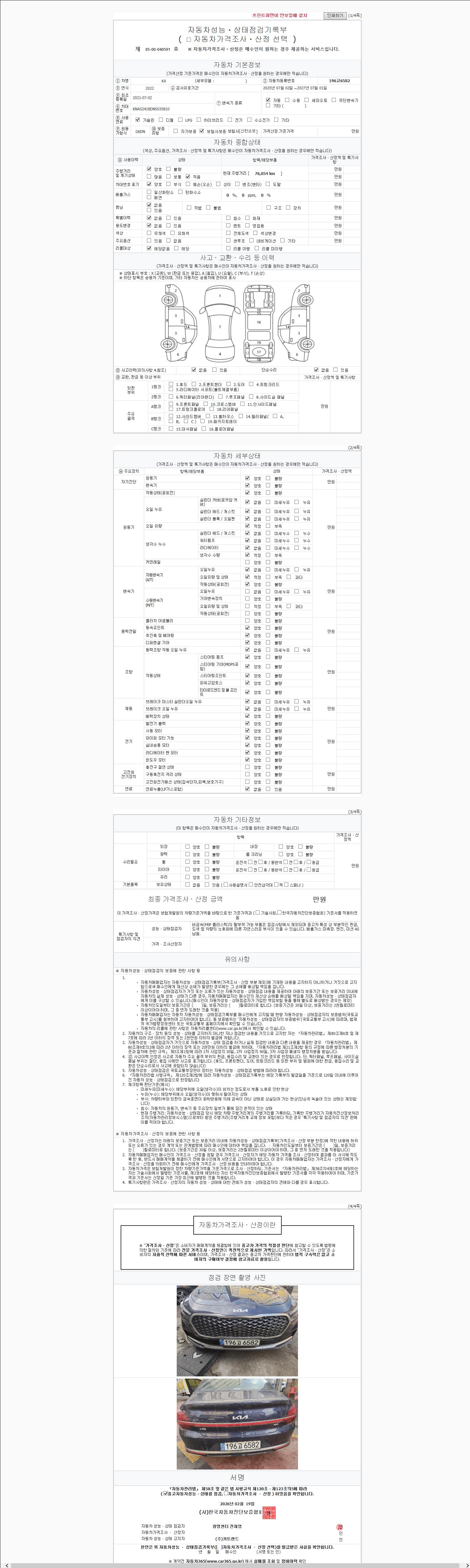 | 주행거리 | 76,054 km | 차량번호 | 196고6582 | 사고유무 | 성능기록부 참조 | 제시번호 | 제 2147483647 호 |