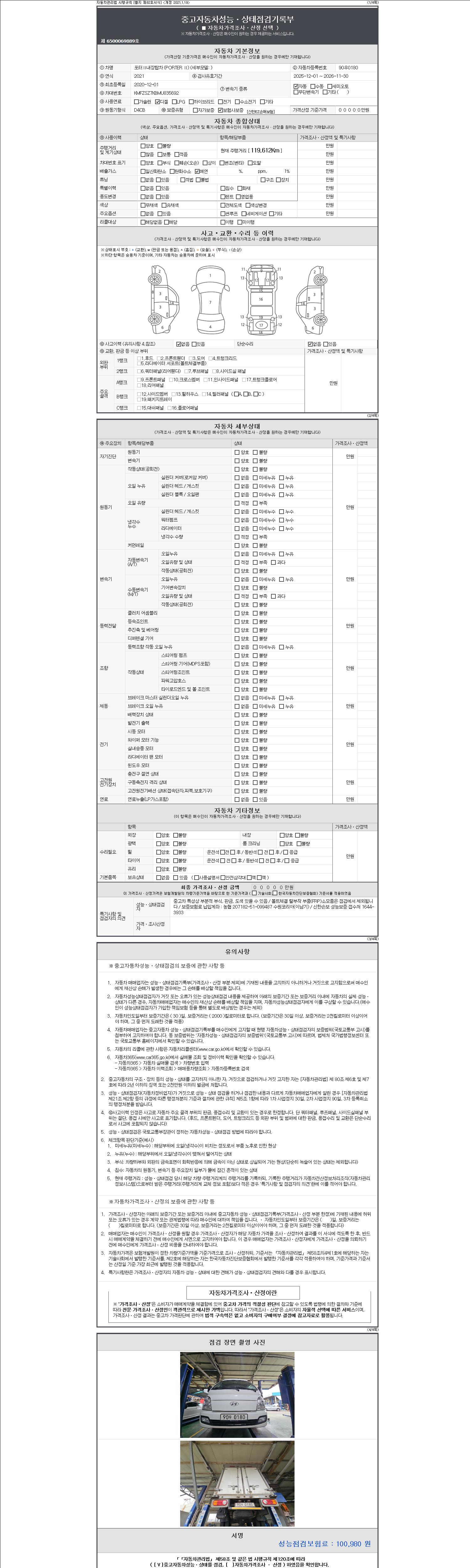 자동차관리법 시행규칙 제120조의 규정에 따라 별지 제 82호서식 《중고자동차 성능, 상태점검 기록부》를 발행한 성능, 상태점검자 및 매매자는 아래의 보증기간 또는 보증거리 이내의 중고자동차, 성능점검 기록부에 기재된 내용과 자동차의 실제 성능, 상태가 다른 경우 계약 또는 관계법령에 따라 매수인에 대하여 책임을 집니다.