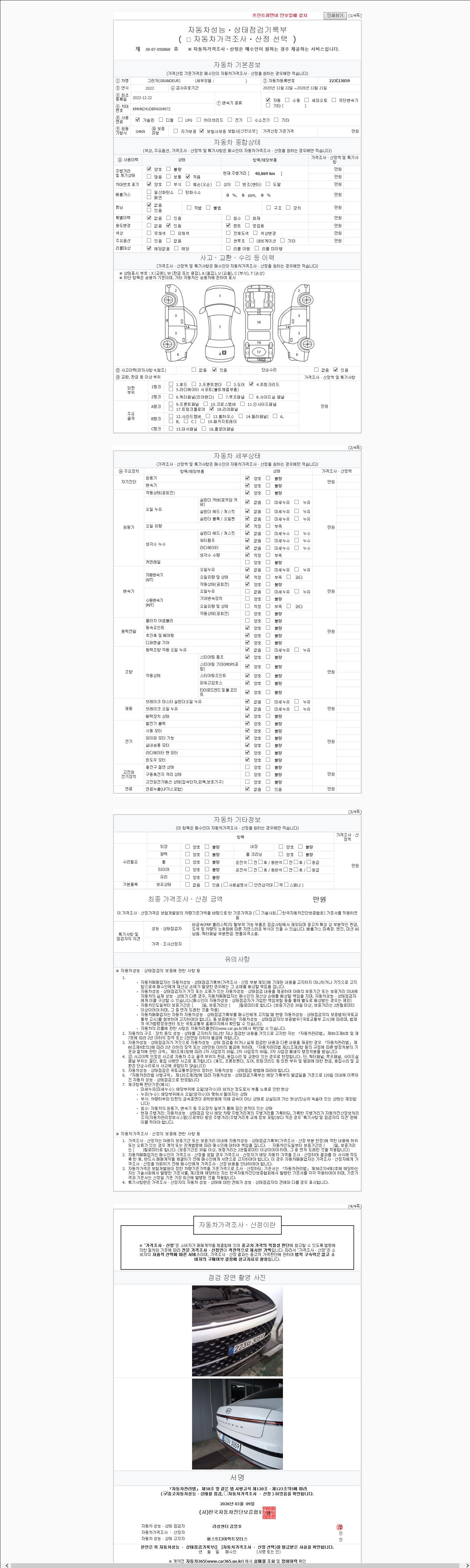 -중고자동차 매매업자를 통해 차량을 구입하실 경우 반드시 "중고자동차 성능, 상태점검 기록부"를 교뷰 받으셔야 하며, 매매업자는 반드시 의무 교부 하여야 압니다.