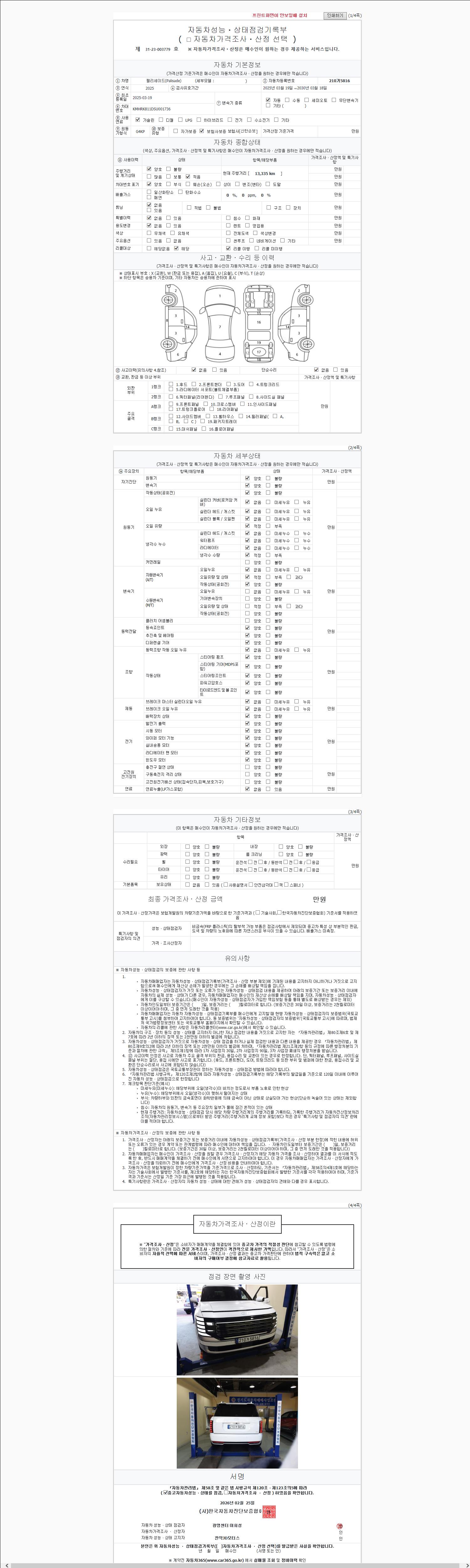 | 주행거리 | 13,335 km | 차량번호 | 210거5816 | 사고유무 | 성능기록부 참조 | 제시번호 | 제 2147483647 호 |