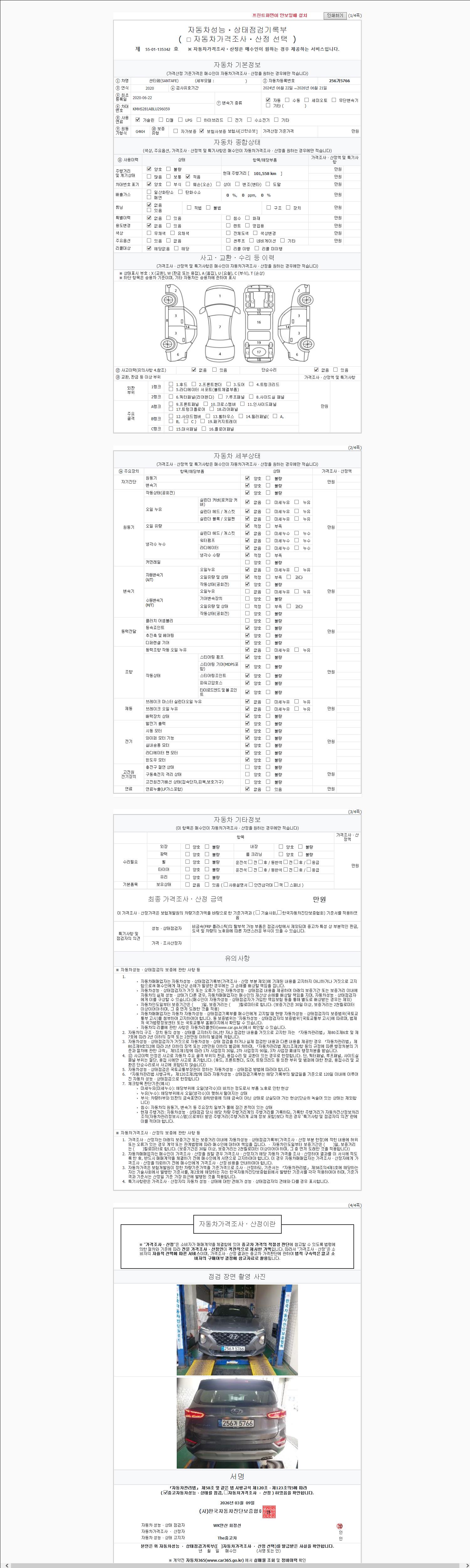 | 주행거리 | 101,558 km | 차량번호 | 256가5766 | 사고유무 | 성능기록부 참조 | 제시번호 | 제 2147483647 호 |