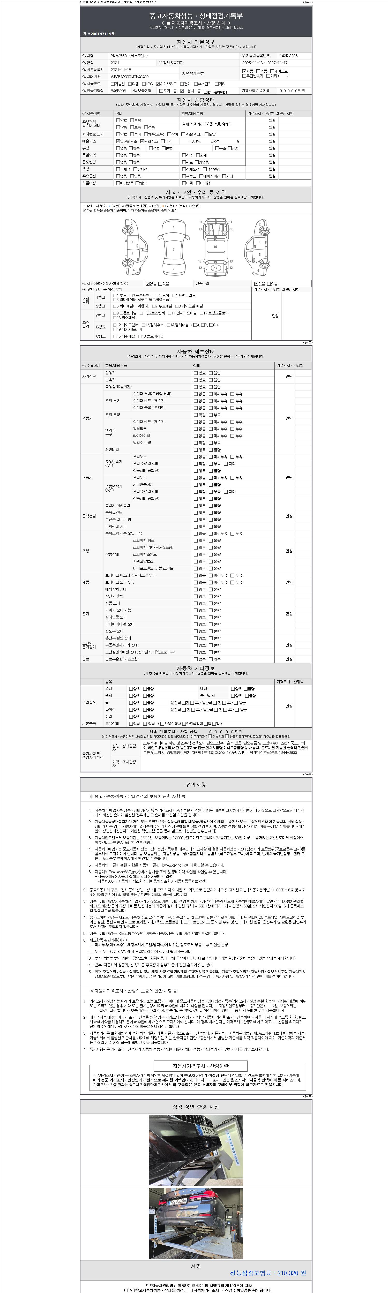 자동차관리법 시행규칙 제120조의 규정에 따라 별지 제 82호서식 《중고자동차 성능, 상태점검 기록부》를 발행한 성능, 상태점검자 및 매매자는 아래의 보증기간 또는 보증거리 이내의 중고자동차, 성능점검 기록부에 기재된 내용과 자동차의 실제 성능, 상태가 다른 경우 계약 또는 관계법령에 따라 매수인에 대하여 책임을 집니다.