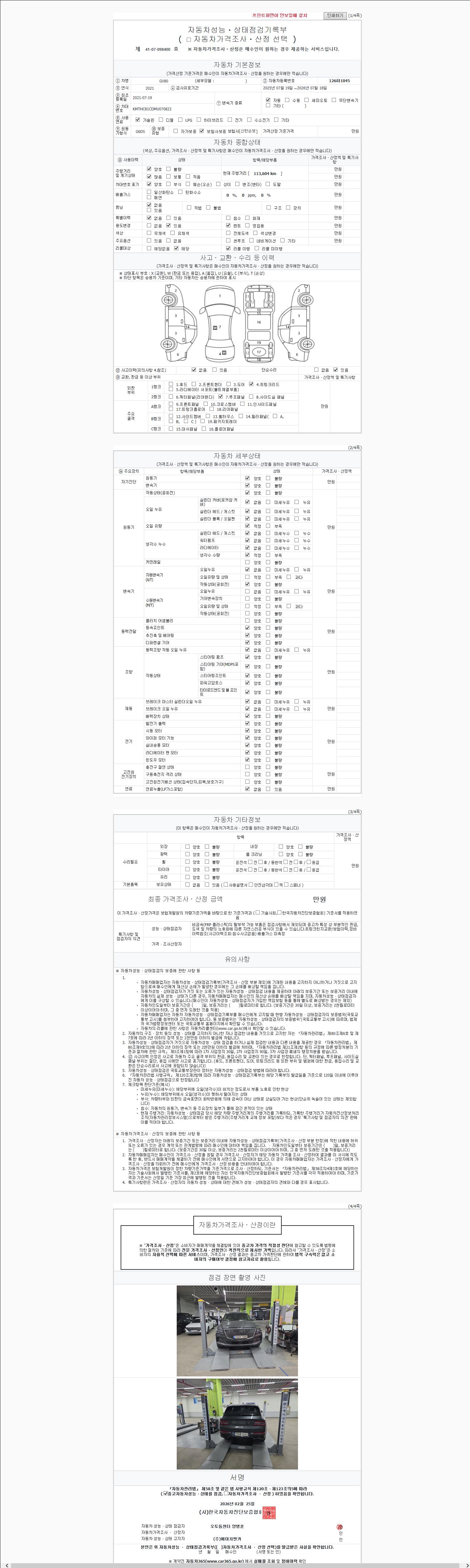 | 주행거리 | 113,604 km | 차량번호 | 126하1045 | 사고유무 | 성능기록부 참조 | 제시번호 | 제 2147483647 호 |