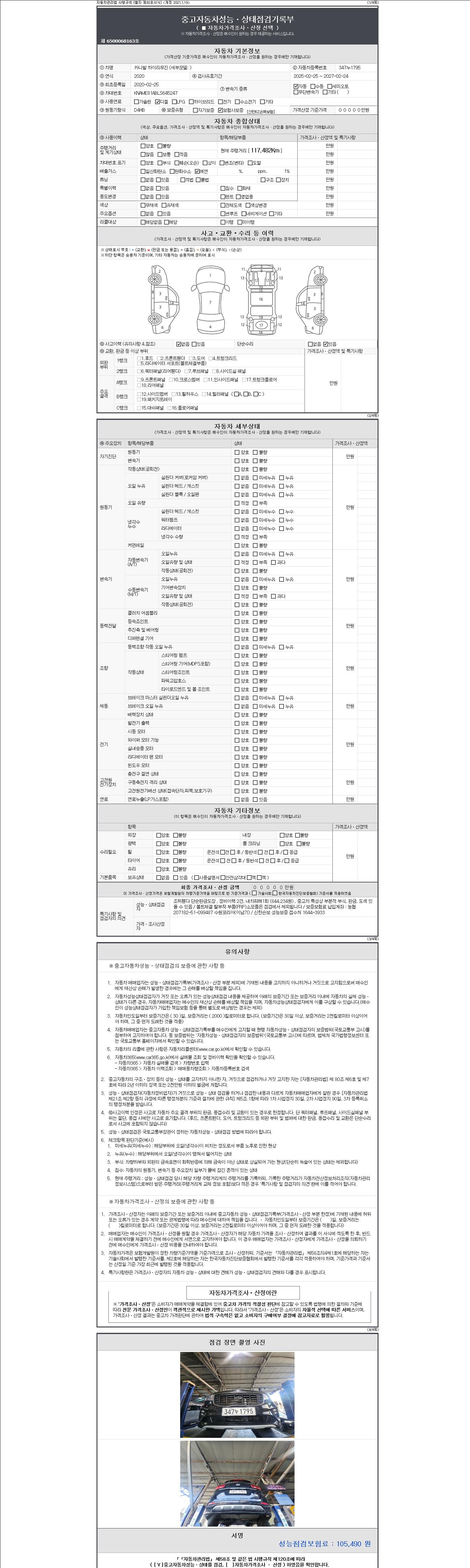 | 주행거리 | 117,482 km | 차량번호 | 347누1795 | 사고유무 | 성능기록부 참조 | 제시번호 | 제 2147483647 호 |