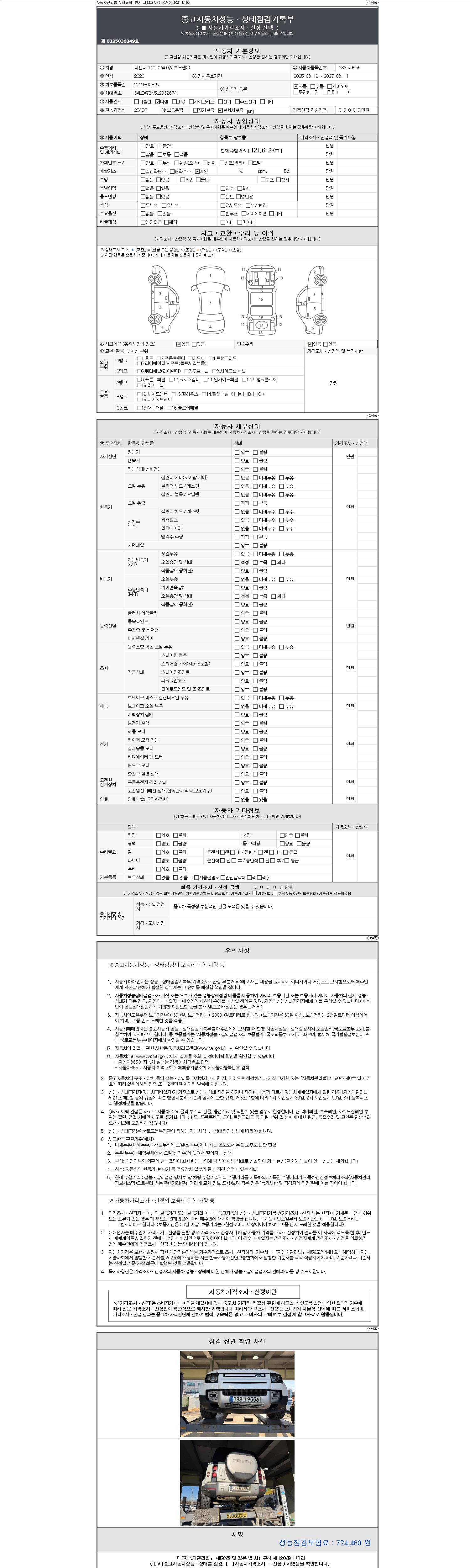 | 주행거리 | 121,612 km | 차량번호 | 388고9556 | 사고유무 | 성능기록부 참조 | 제시번호 | 제 2147483647 호 |