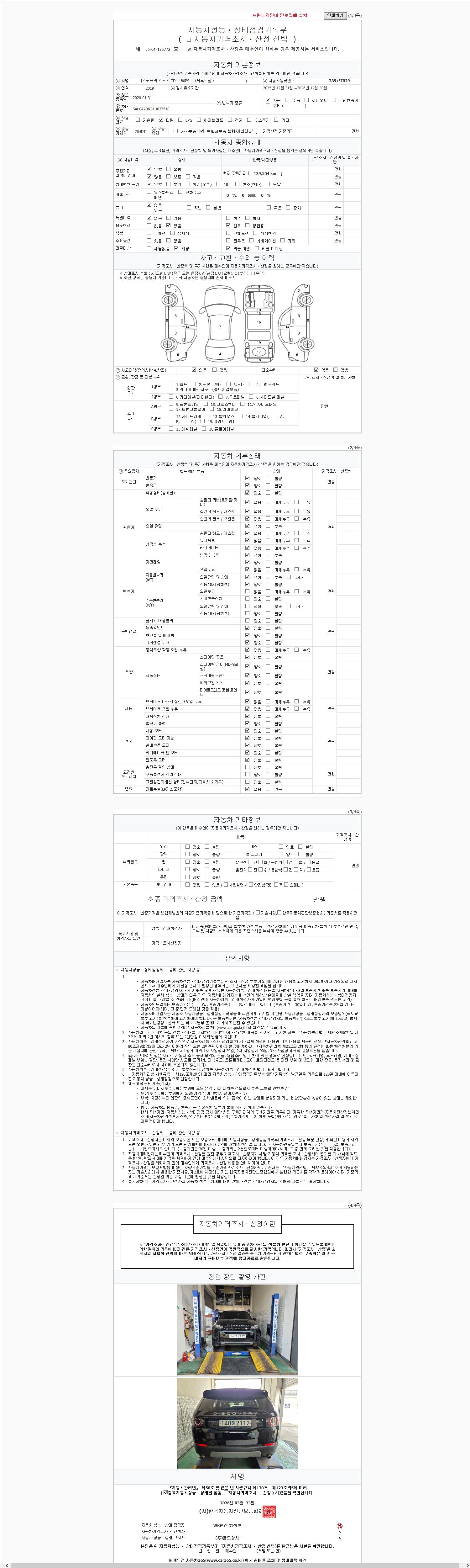 자동차관리법 시행규칙 제120조의 규정에 따라 별지 제 82호서식 《중고자동차 성능, 상태점검 기록부》를 발행한 성능, 상태점검자 및 매매자는 아래의 보증기간 또는 보증거리 이내의 중고자동차, 성능점검 기록부에 기재된 내용과 자동차의 실제 성능, 상태가 다른 경우 계약 또는 관계법령에 따라 매수인에 대하여 책임을 집니다.